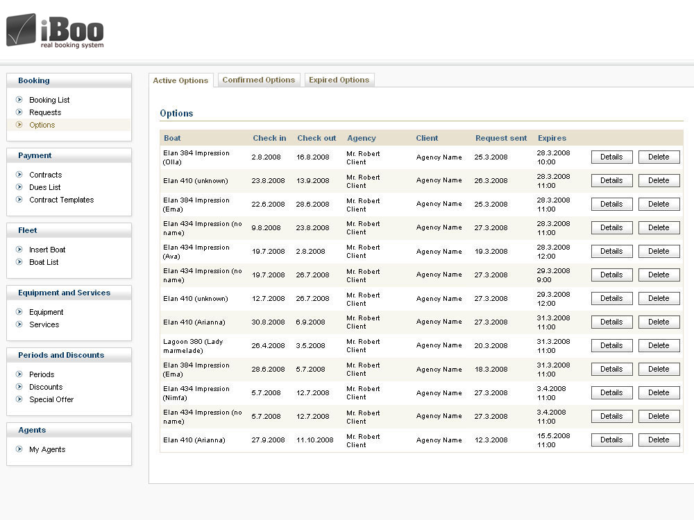 Options lista prikazuje popise aktivnih, potvrđenih i isteklih opcija. Pregledavajući detalje opcija moguće je poništiti opciju, stvoriti booking(rezervaciju) ili produžiti valjanost opcije. Potvrđene opcije su one za koje su partneri isposlovali booking te od vas zahtjevaju da zaključite proces rezervacije plovila. Na pregledu isteklih opcija postoji mogućnost brzog uklanjanja svih isteklih opcija.
