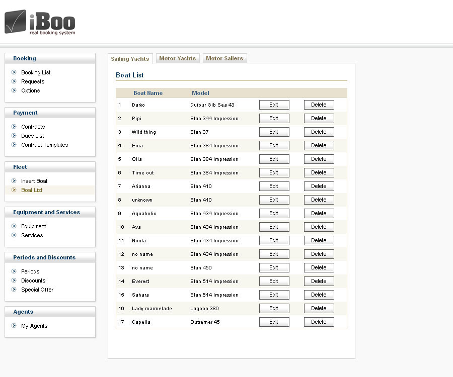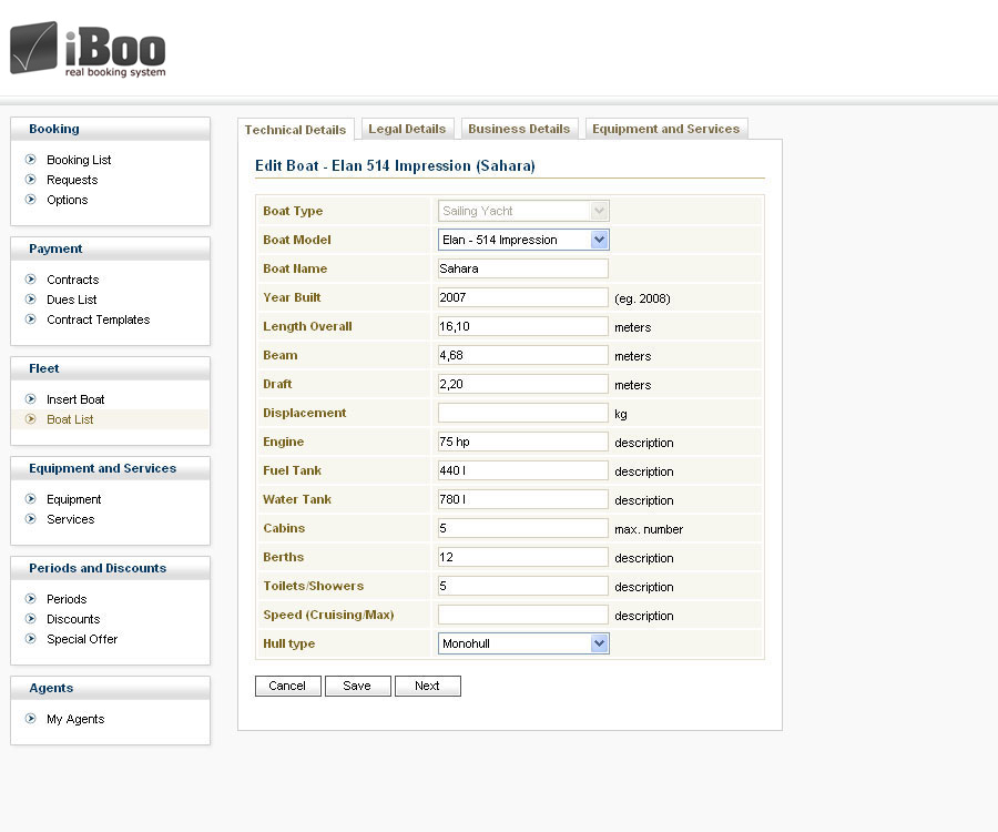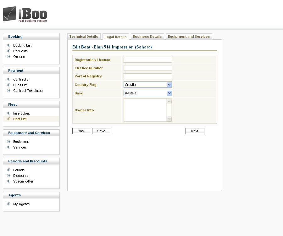 Ova kontrola služi za upravljanje karakteristikama i cjenama plovila u ponudi. Podjeljena je na četiri cjeline. Prvu cjelinu čine osnovni podaci o plovilu kao što su proizvođač, model, dužina i sl. Druga cjelina sadrži pravne detalje plovila. U trećoj cjelini se definiraju poslovni detalji plovila, načini plaćanja, depozit i cjenik za određene periode. Cjene usluga i opreme se definiraju u četvroj cjelini. Za svaki komad opreme ili uslugu moguće je definirati na koji je način rasploživa na plovilu (kao dodatna usluga, kao obvezna dodatna usluga, kao uključena usluga). Također, u ovoj cjelini je moguće kao dodatnu uslugu odrediti dozvoljene „one way“ rute plovila.