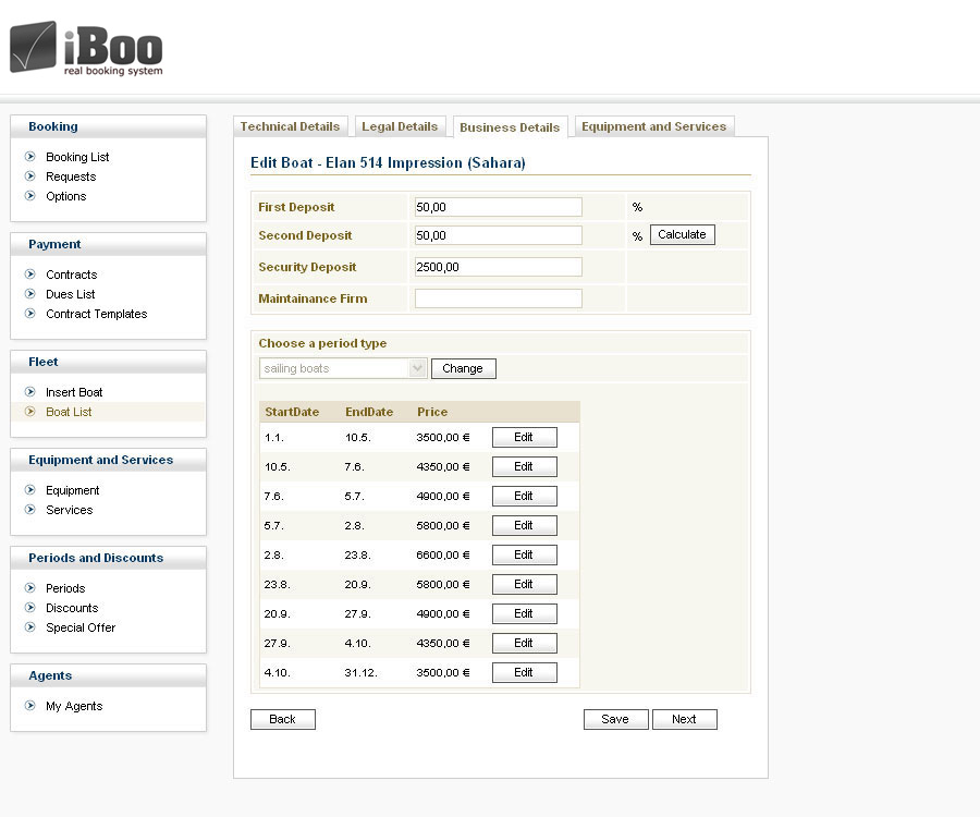 Business details kartica služi za unos vrijednosti depozita te pridodavanje predefiniranih perioda i unos cijena najma plovila