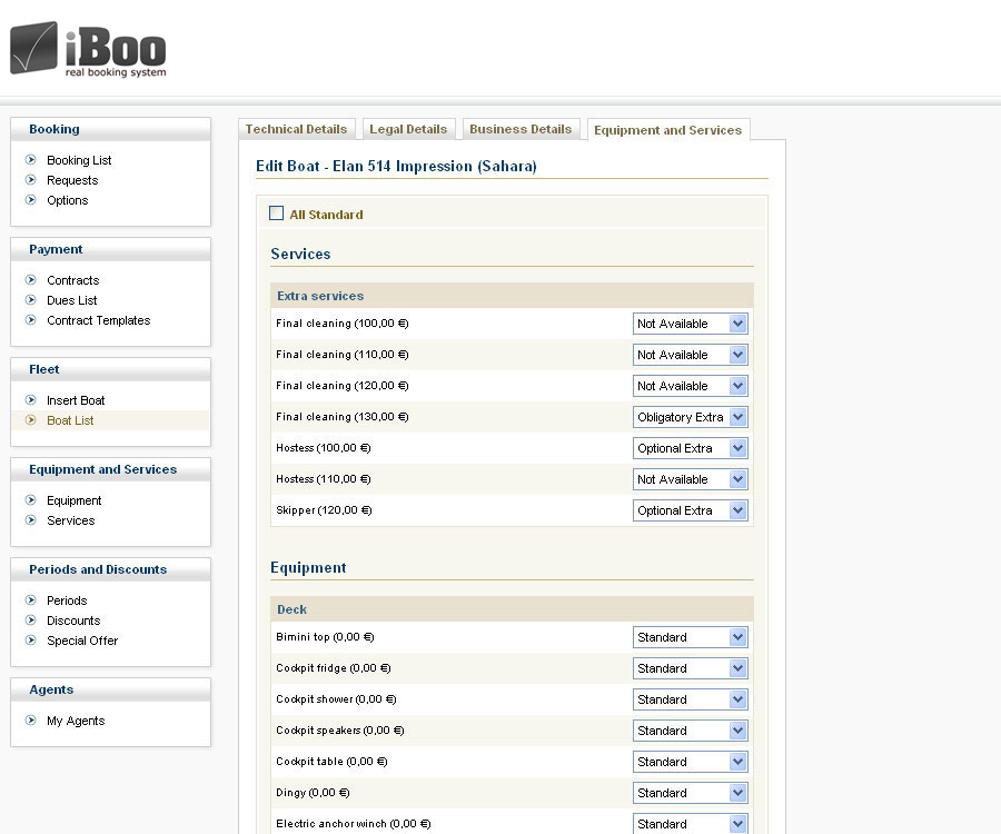 Preko kartice Equipment and services dodjeljujemo plovilu standardu i dodatnu ponudu opreme i usluga